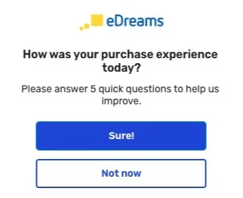 This popup features both a question (“How was your purchase experience today?”) and a request (“Please answer 5 quick questions to help us improve”).