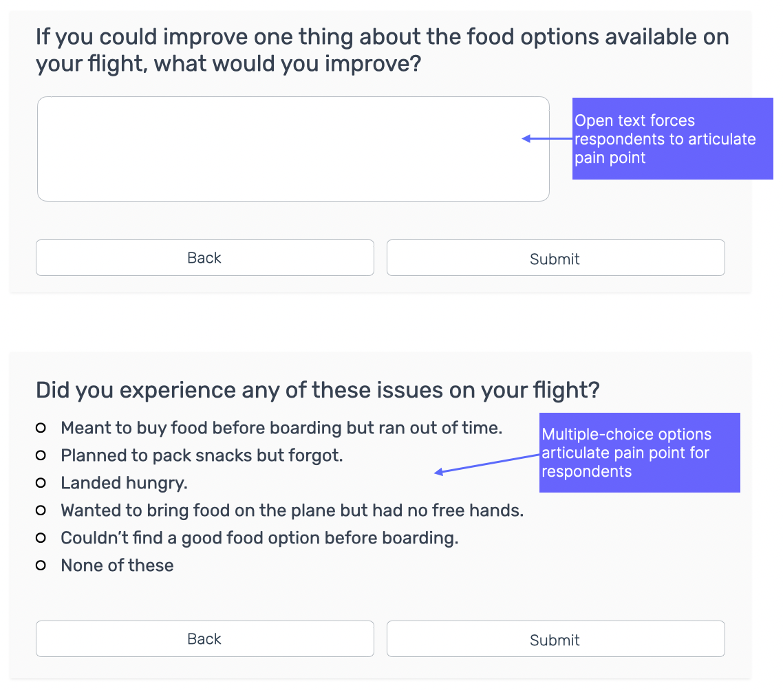 The goal isn’t to persuade. It’s to articulate the half-formed thoughts and opinions that people won’t take time to express for themselves. Avoid open textboxes and use multiple-choice instead. Try to give people an option that makes them think, “Yes, that’s exactly how I feel.”