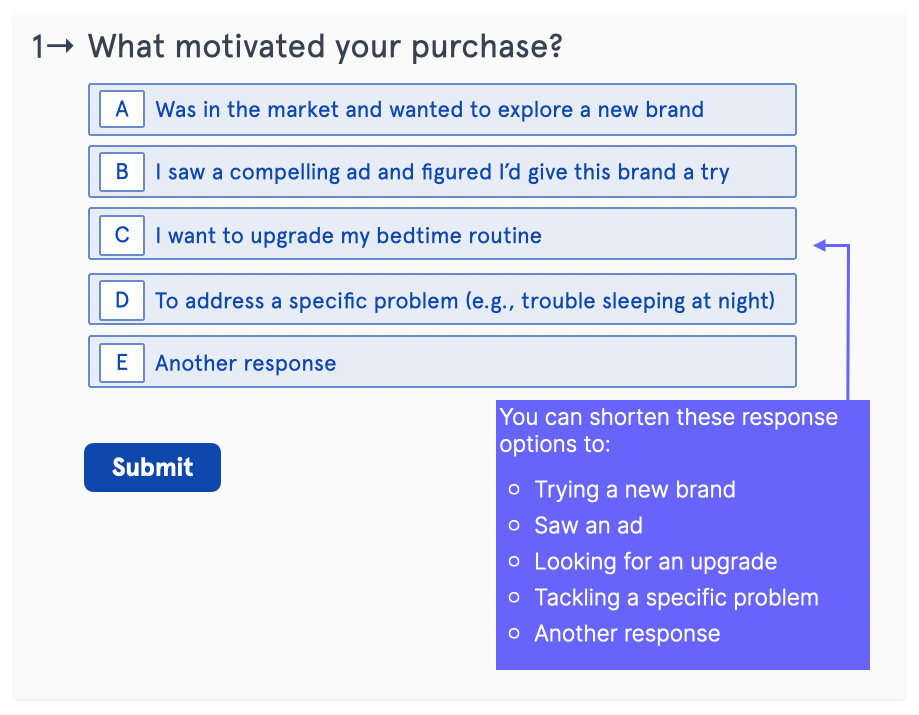 Long response options always have concise alternatives. “I saw a compelling ad and figured I’d give this brand a try” can be, “Saw an ad.”