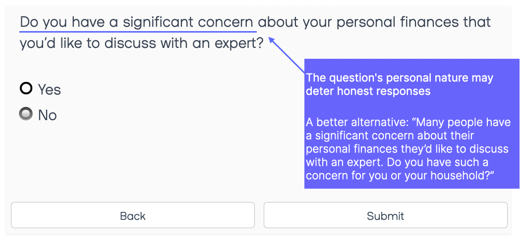 For instance, in a test survey for a fintech brand, not one of the 15 respondents acknowledged having a “significant financial concern,” despite earlier research showing that most of us do.