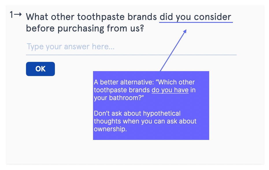 Since not everyone “considers” other brands before a purchase — and those who do usually struggle to remember what they considered — the question "What brands did you consider…. ?" is both presumptive and hard.