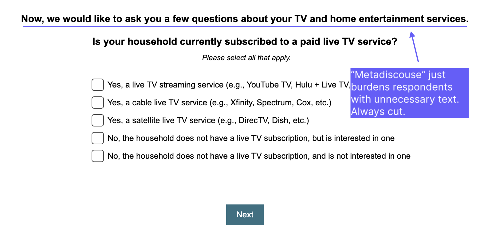 Metadiscourse is unnecessary guidance. It burdens readers, and it should never appear in your surveys.