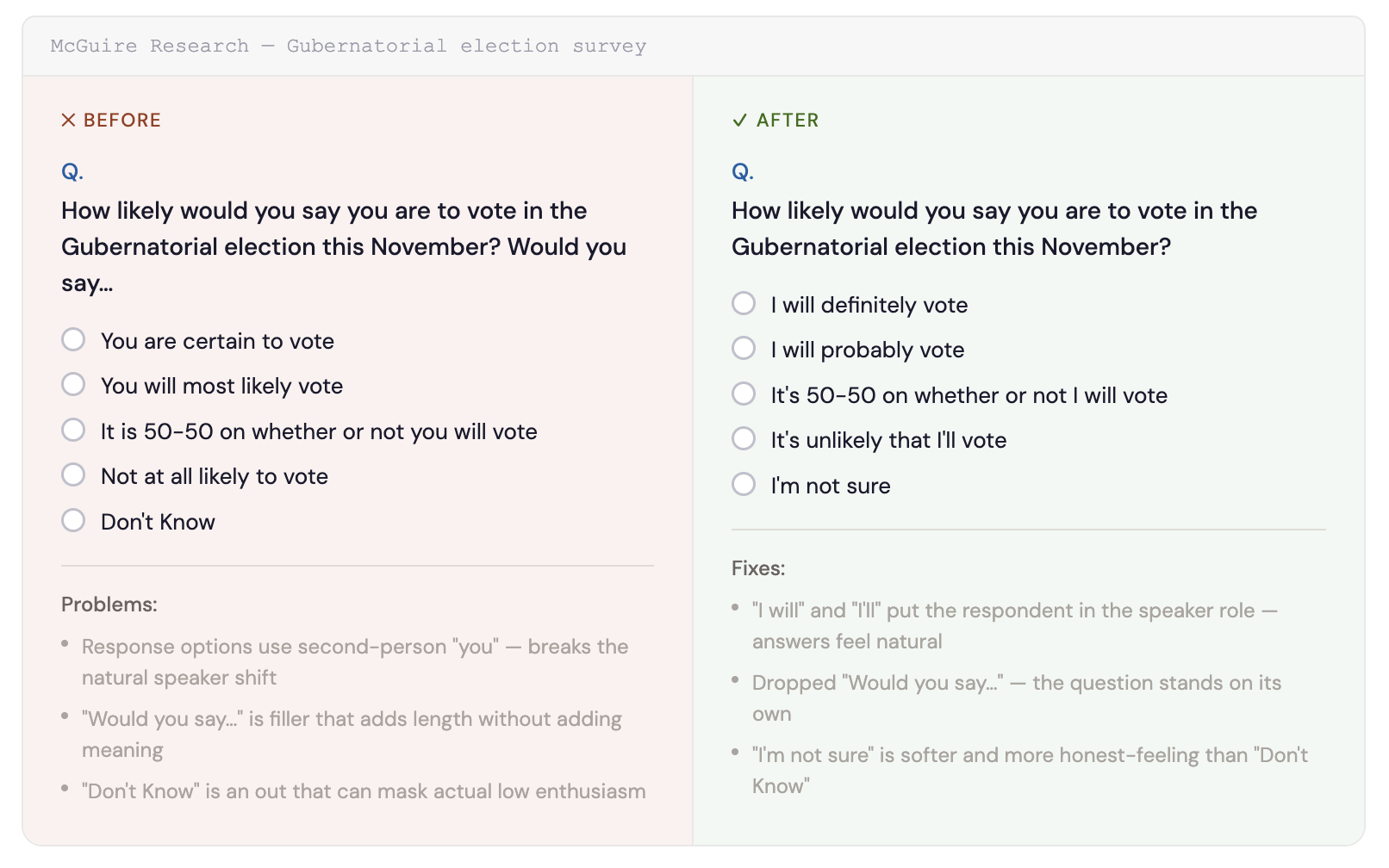 Unlike a landing page, there’s no obvious feedback loop. If you write "You are certain to vote," the respondent still picks an answer. You still get the data.